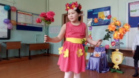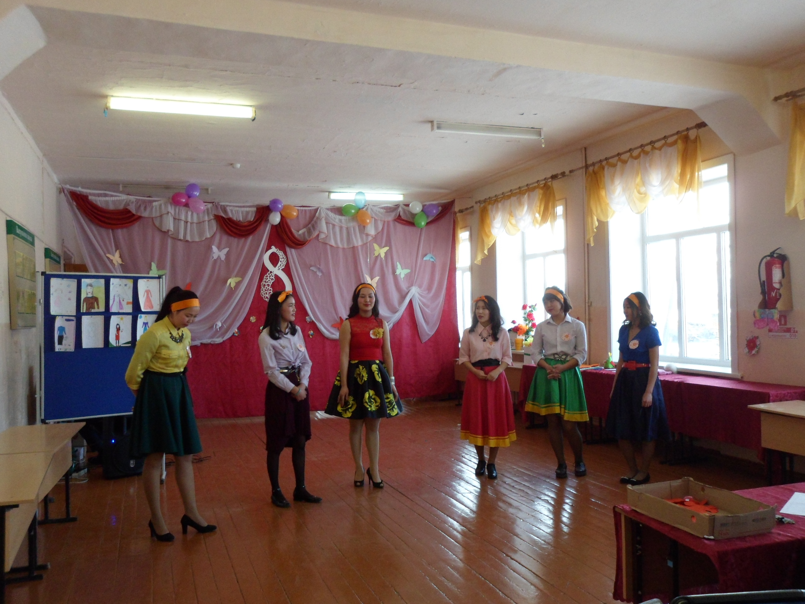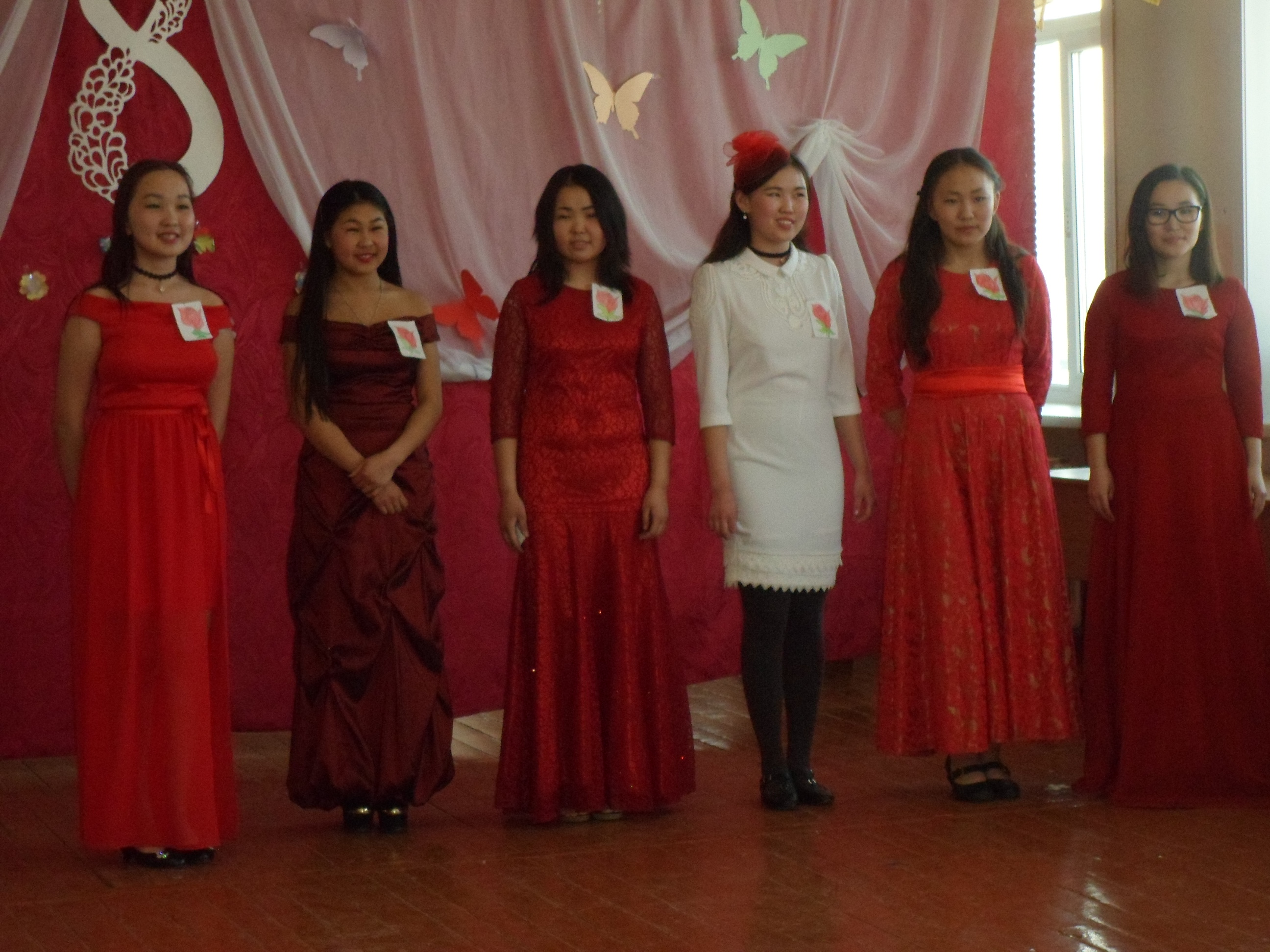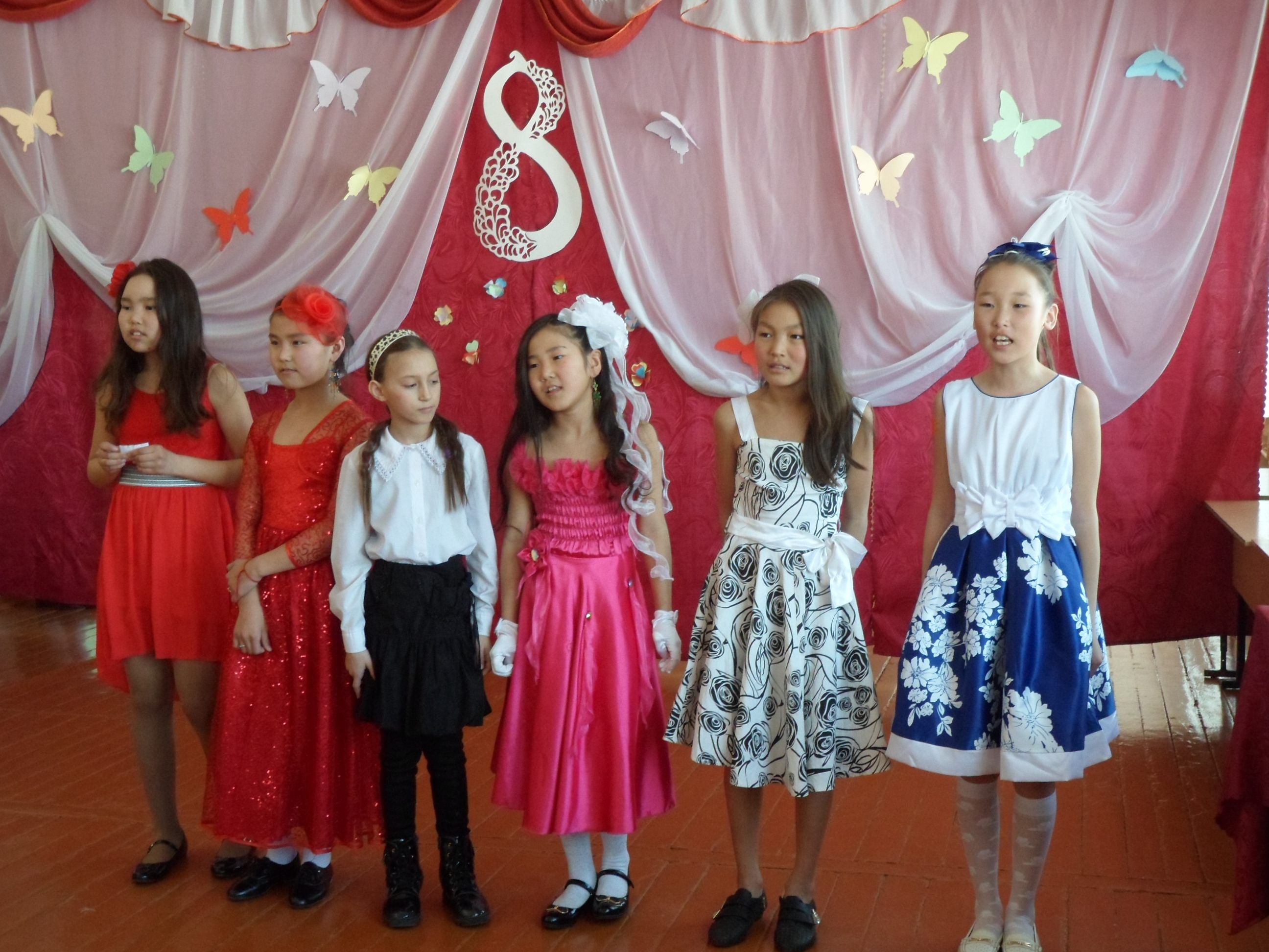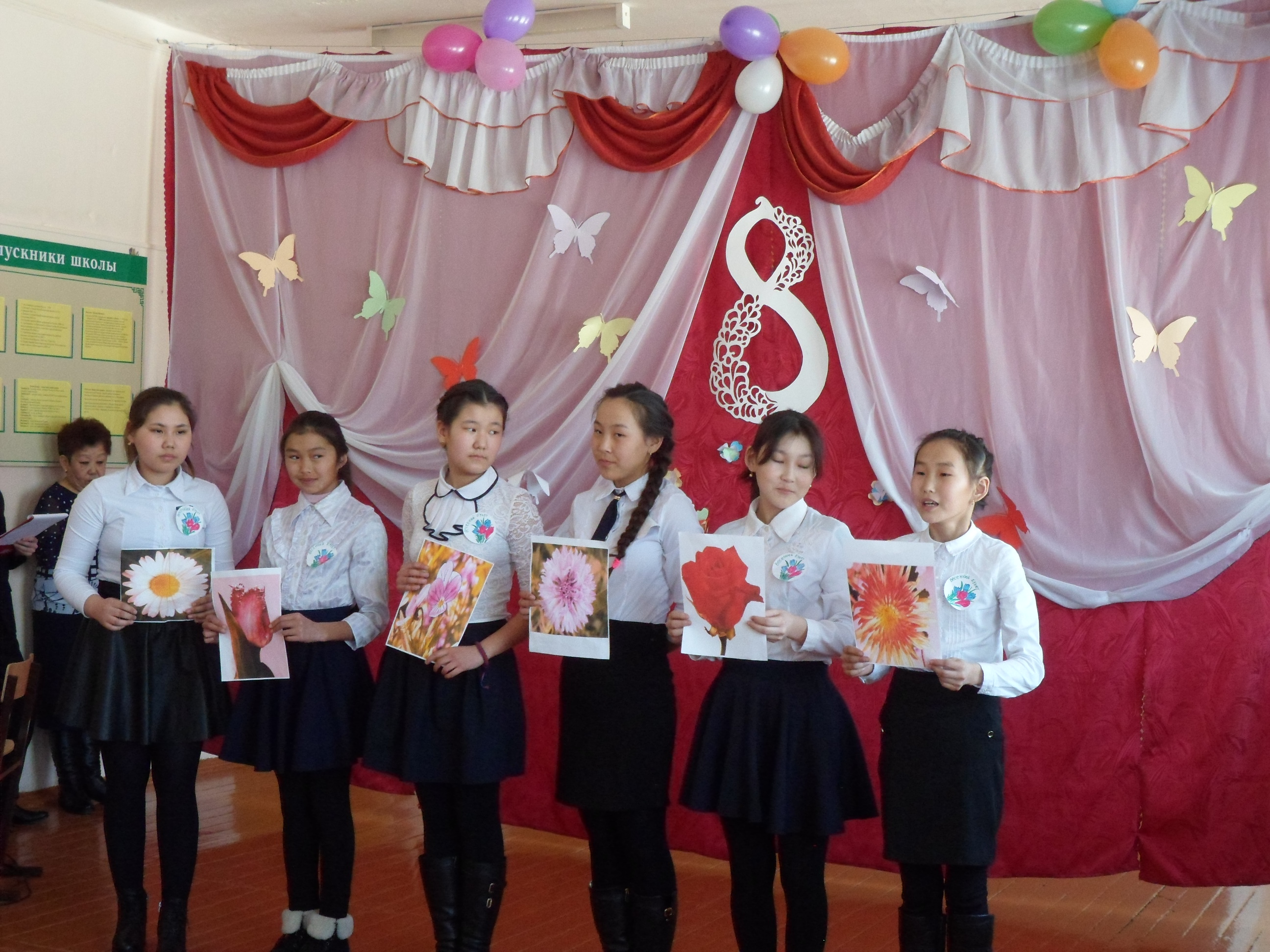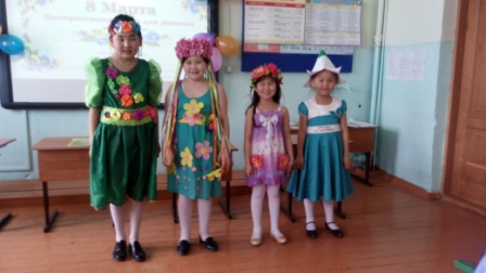 10 марта среди учащихся начальной школы прошел конкурс "Весняночка", посвященный 8 марта. В этом конкурсе приняли участие 4 девочки (от каждого класса были по одной участнице): Жамбалова Янжима - 1 класс, Данжеева Александра - 2 класс, Халудорова Димита - 3 класс, Улукшонова Аюна - 4 класс. Девочки состязались в различных конкурсах: визитная карточка, кулинарный, представили свои увлечения, художественный, интеллектуальный.