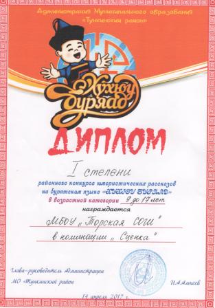 14 апреля прошел районный конкурс юмористических рассказов на бурятском языке "Хухюу буряад". Ученики нашей школы заняли 1 место в номинации "Сценка". Наши артисты: Янданов Амгалан (9 класс), Янданова Инесса (8 класс), Ангаева Даша (8 класс), Халудоров Андрей (8 класс). Руководитель - Халудорова Наталья Цэдэновна, учитель бурятского языка и литературы. |
